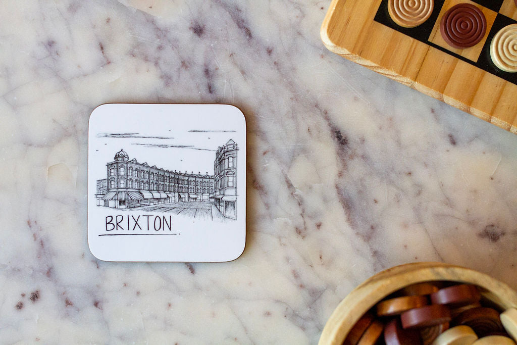 This monochrome drinks coaster features my original illustration of Brixton skyline, with the main image being the market area of this London suburb.