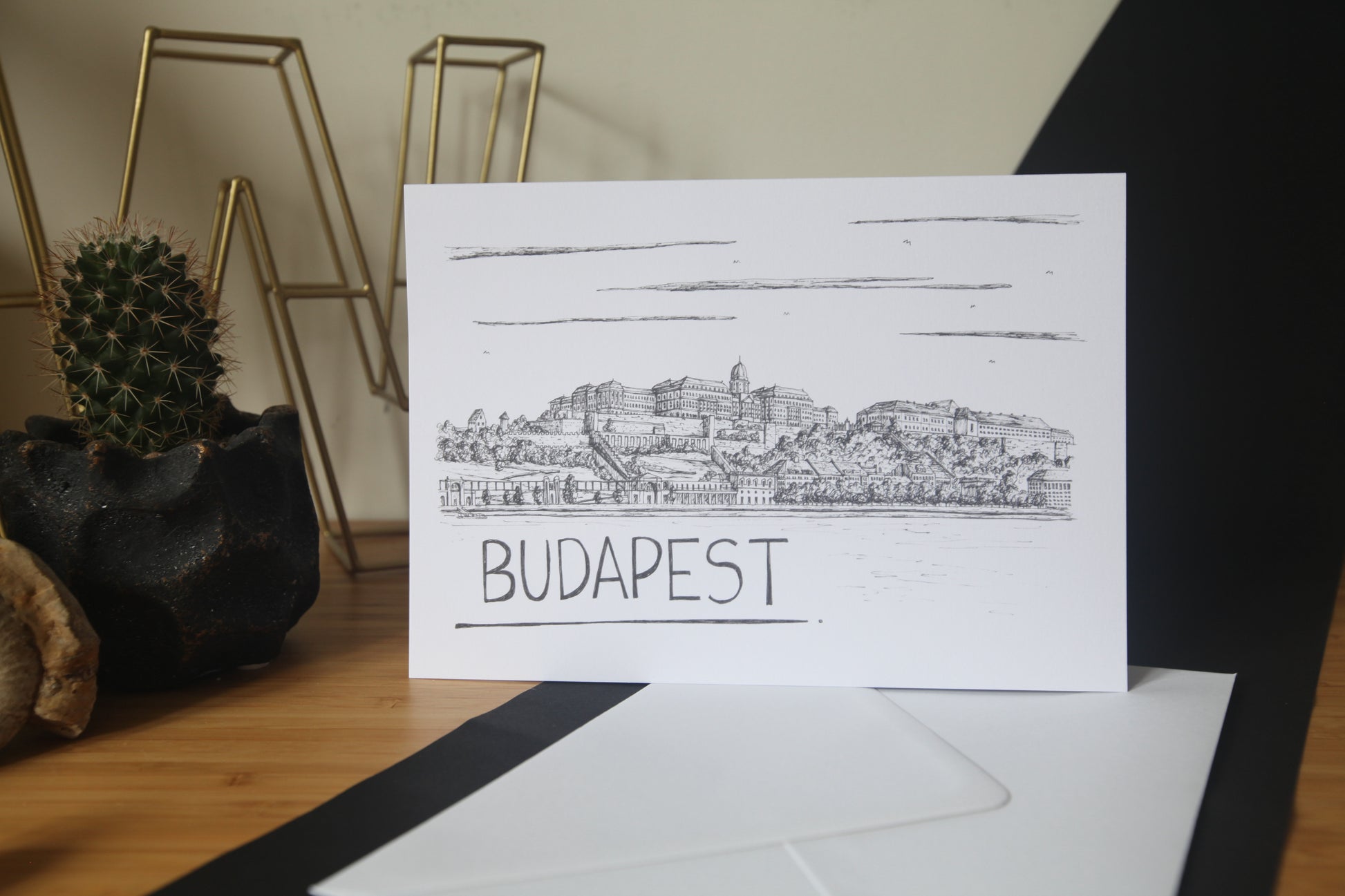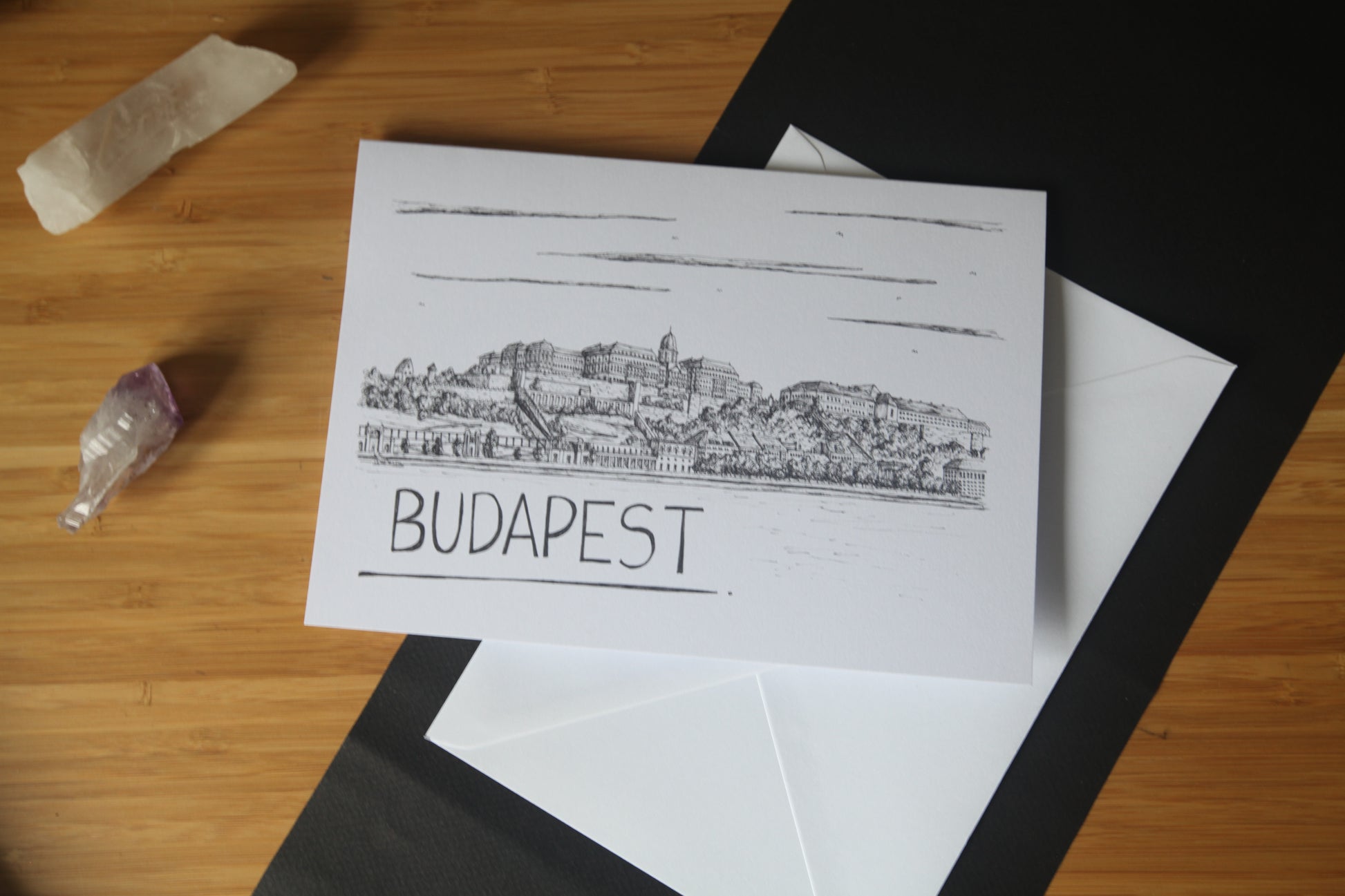 This monochrome greetings card features Budapest skyline with the main focus being on the Danube River with Varhegy in the background.