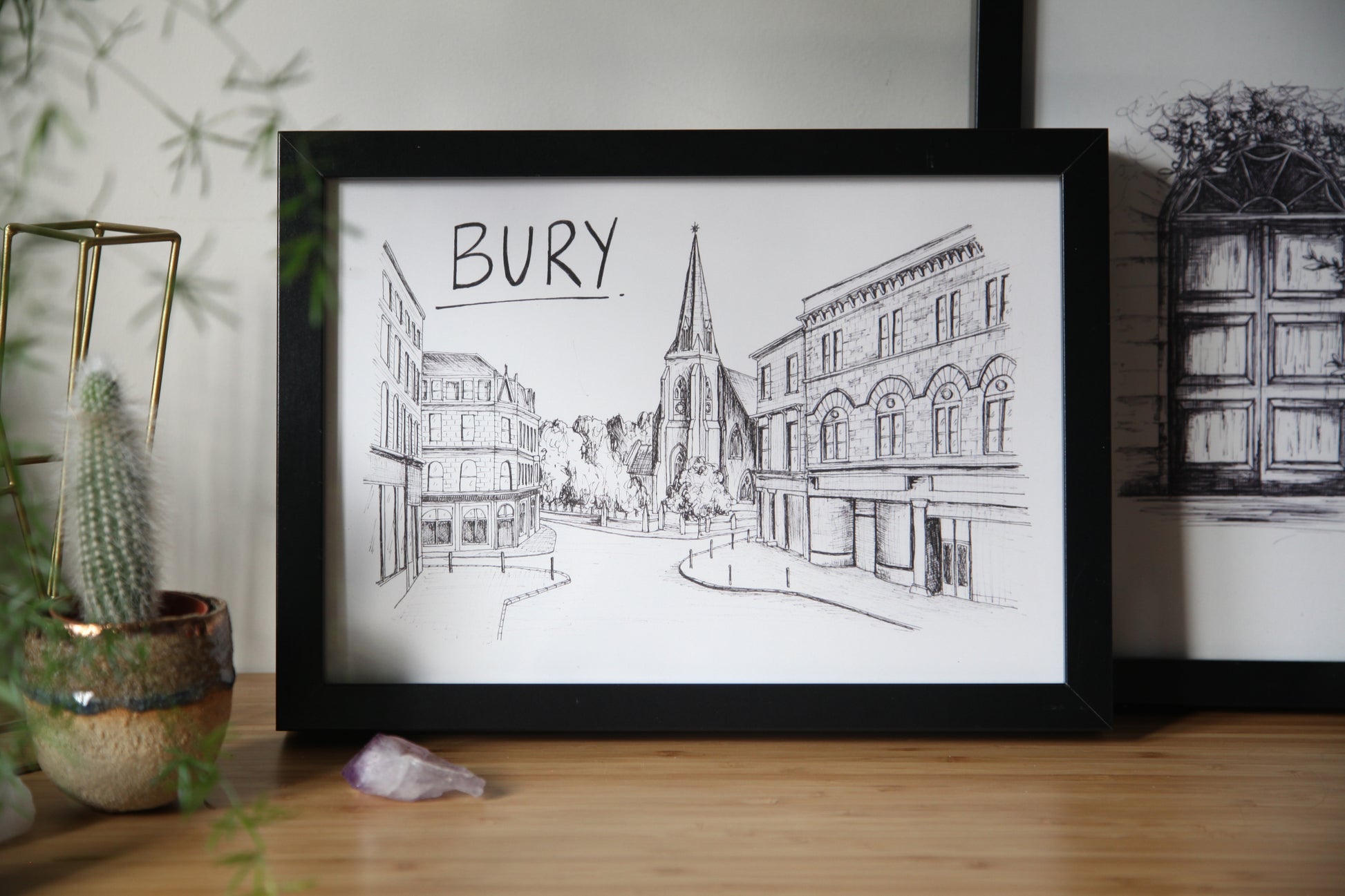 The view of Bury Church is the main focus for this Bury Skyline Print. In black and white so it can fit in any room of the home. A minimalistic line drawn print to give that loved one of yours for a birthday, wedding, anniversary or housewarming.