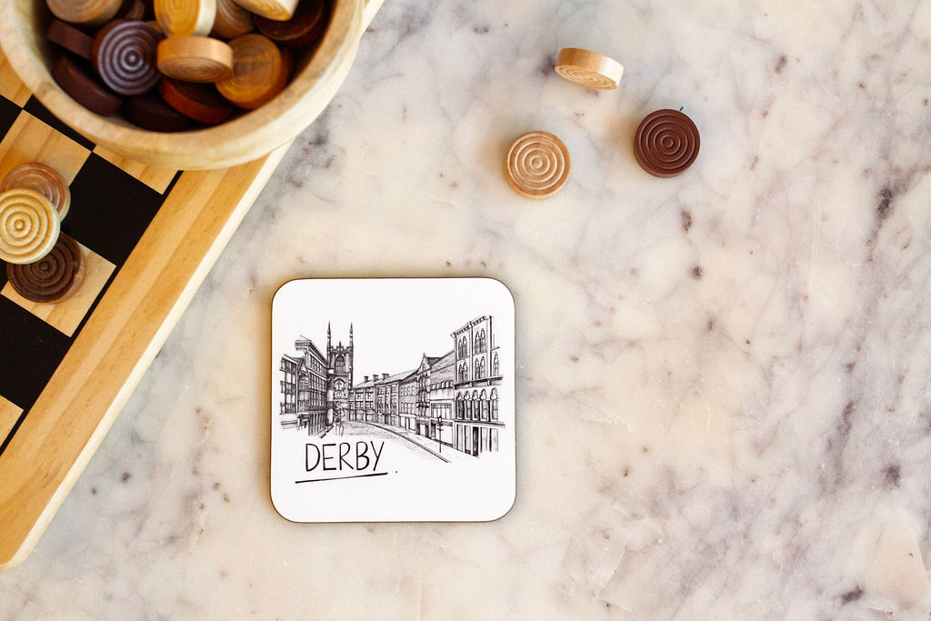 This monochrome coaster features the Derby skyline, an original illustration from myself.