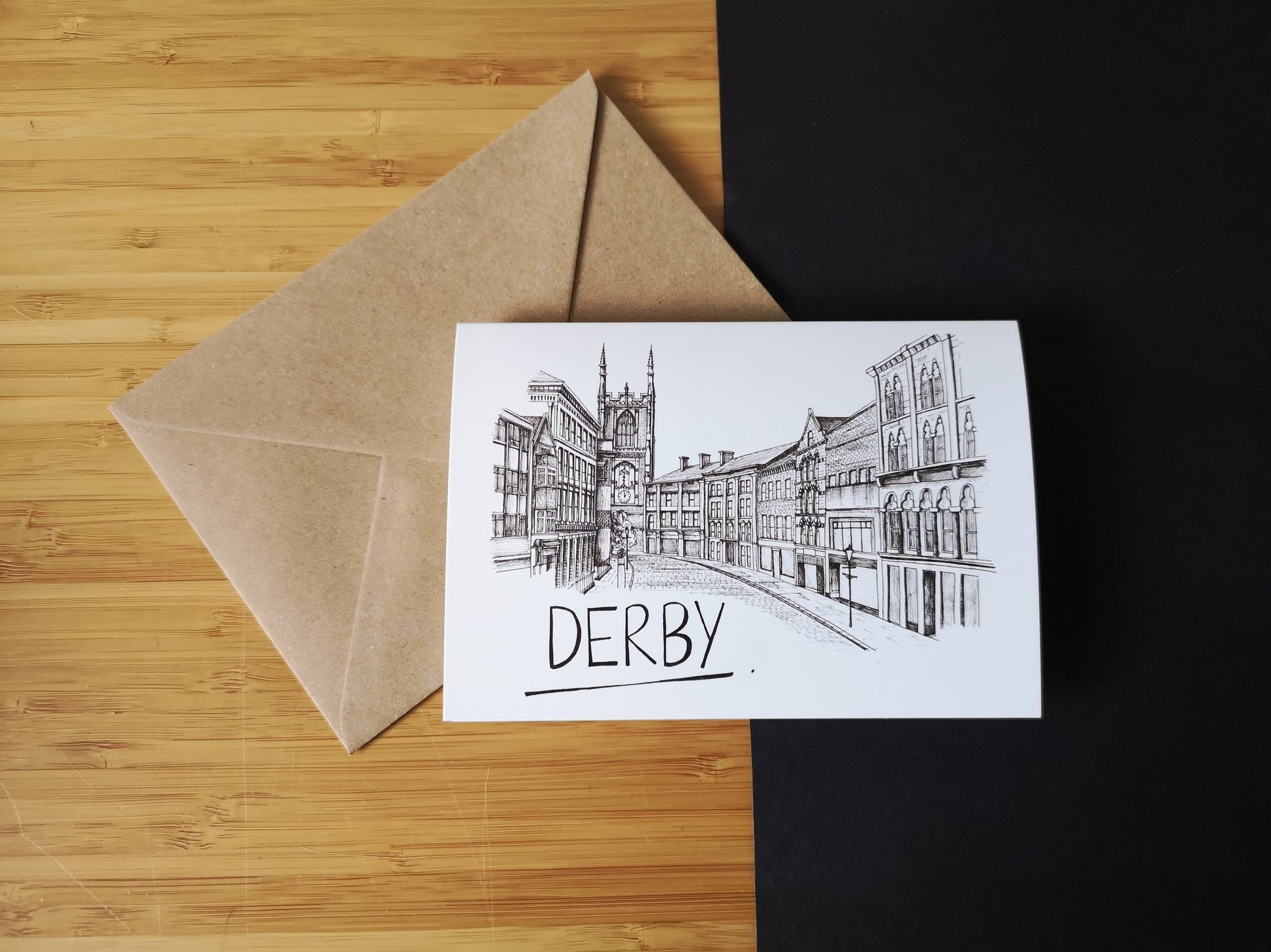 Derby skylines illustration in black and white, coming on this A6 greetings card. Great for the person who lives in Derby or recently visited. Or why not grab this for someone who got married here and it can be a anniversary card?