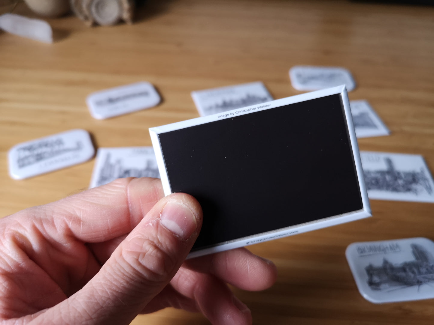 This monochrome souvenir magnet features my illustration of Didsbury skyline, a suburb of Manchester.