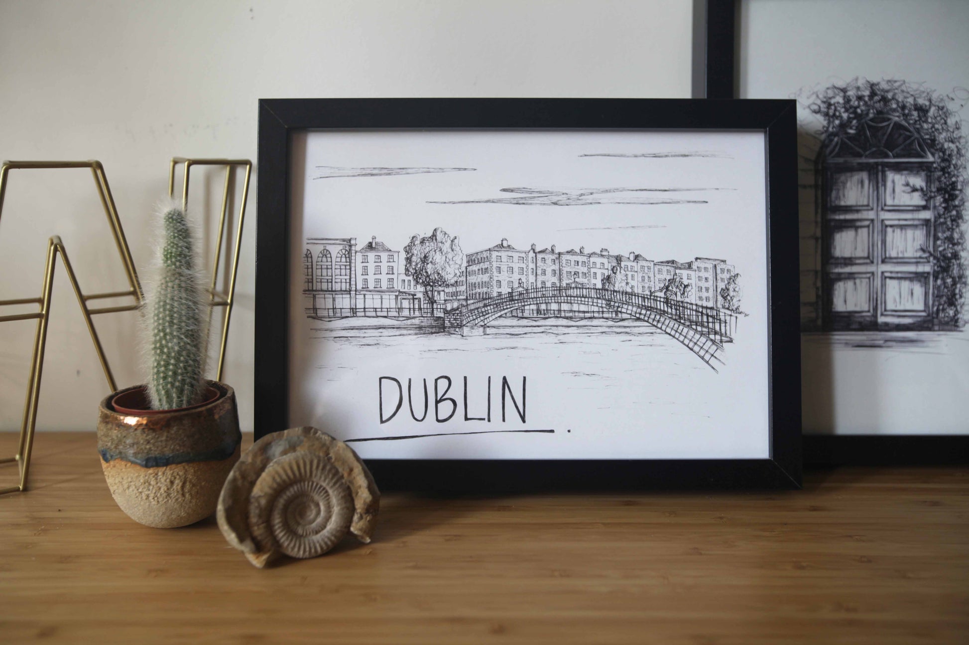 This monochrome illustration of Dublin in Ireland, features Ha'Penny Bridge and the River Liffey. Some of the main attractions to this amazing Irish City.