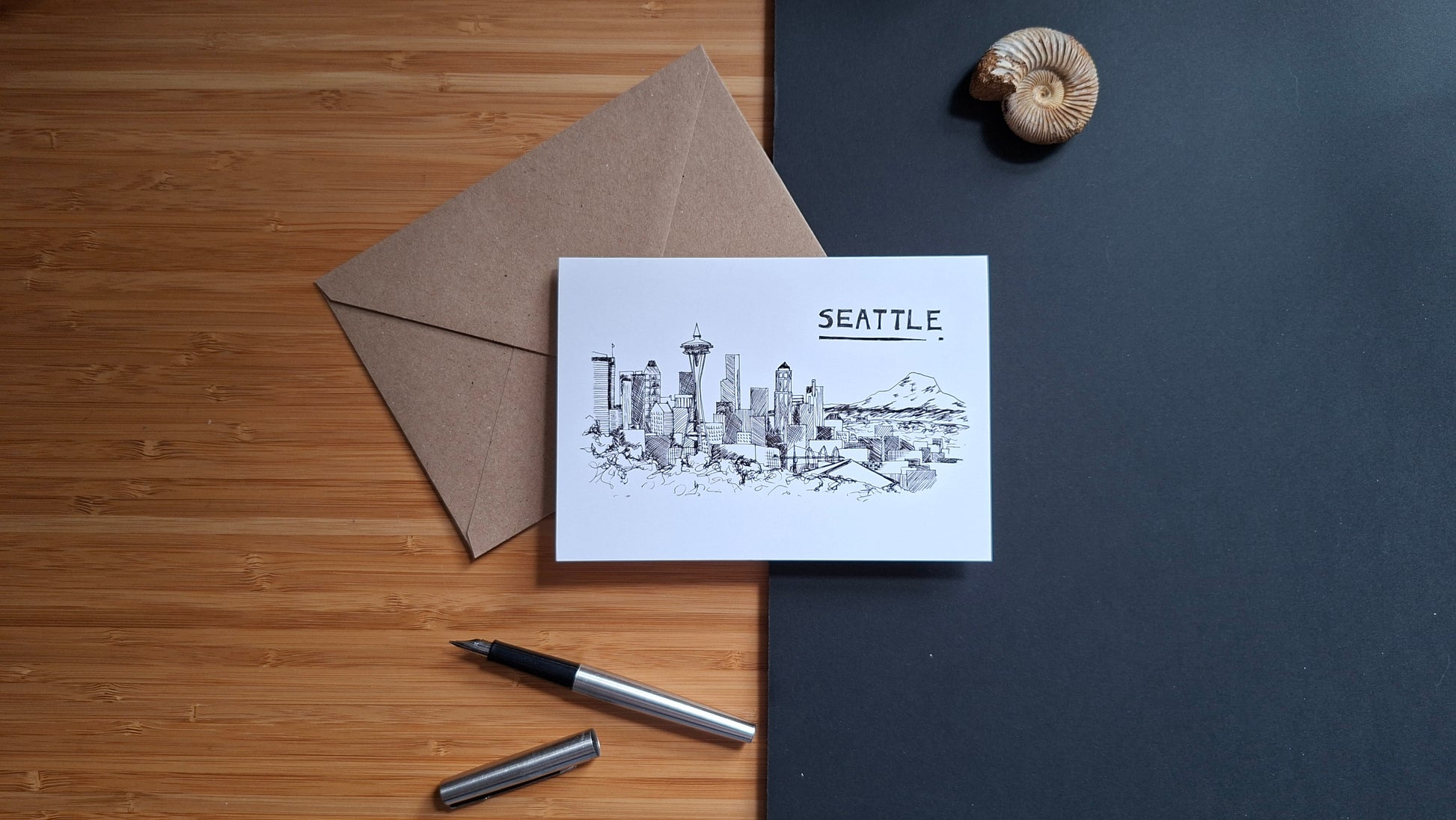 This black and white illustration of Seattle Cityscape will be a lovely greetings card for that couple getting married there, or for someones birthday if they are a lover of Seattle.