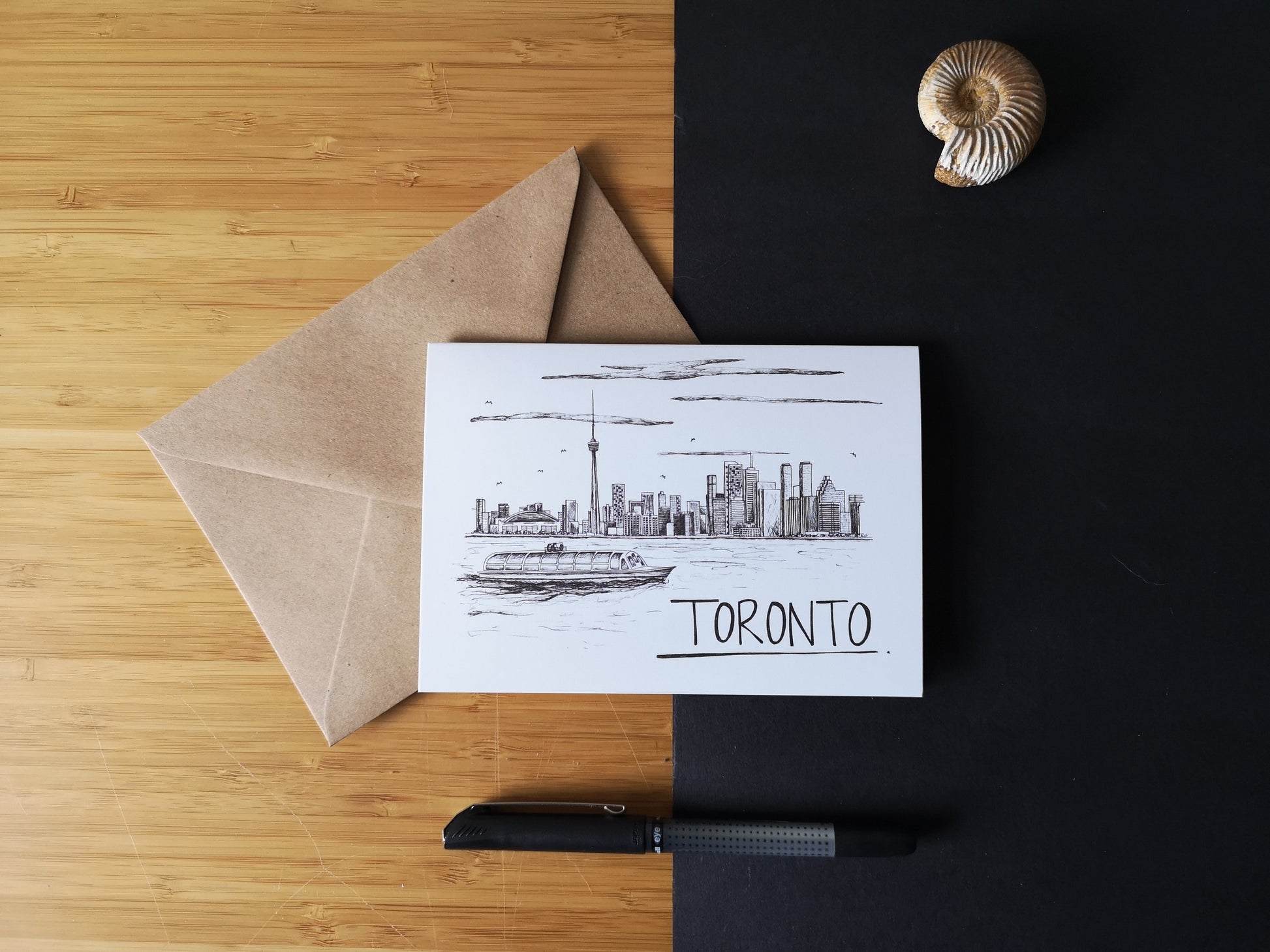 This black and white illustration of Toronto skyline, coming on this greetings card features the waterfront of the city and the CN tower as its focal point. Will be a perfect greetings card to give to that Toronto fan. Whether if its their home or an amazing holiday.