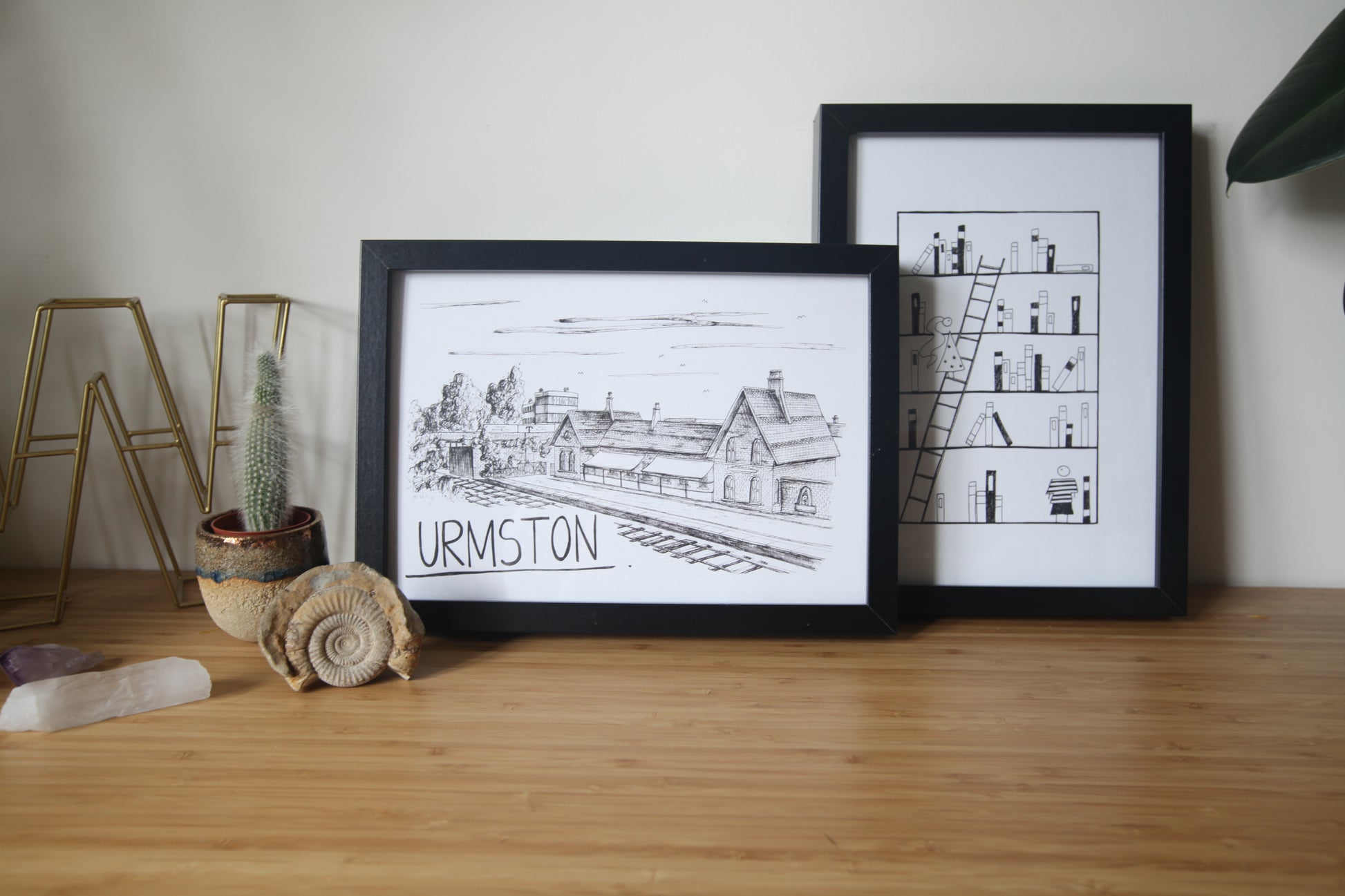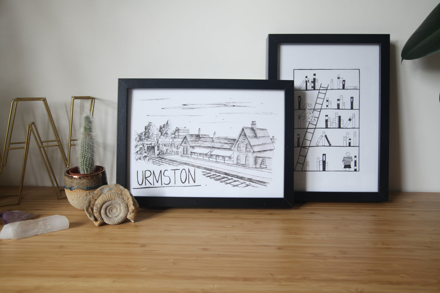 This monochrome art print of Urmston in Greater Manchester is a great gift for that local. Featuring the train station and steamhouse which is one of the go to places in this suburb.